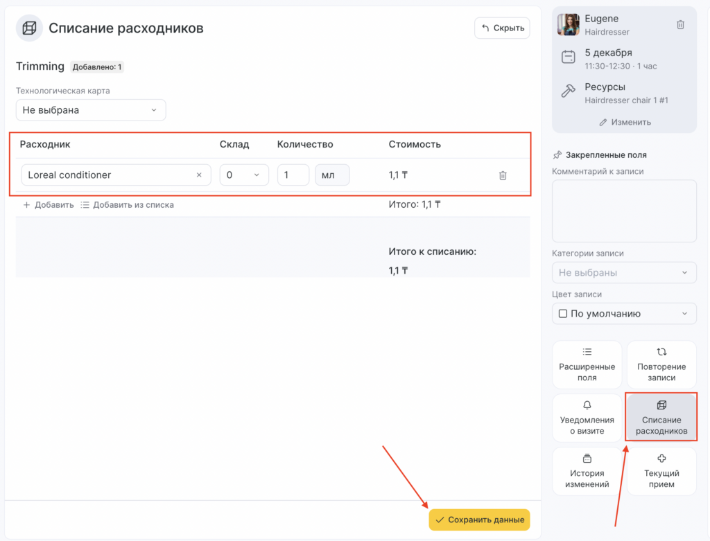 На вкладке «Списание расходников» в окне визита вы можете добавлять расходники вручную, а также просматривать расходники, которые были списаны автоматически при помощи технологической карты, и редактировать их.