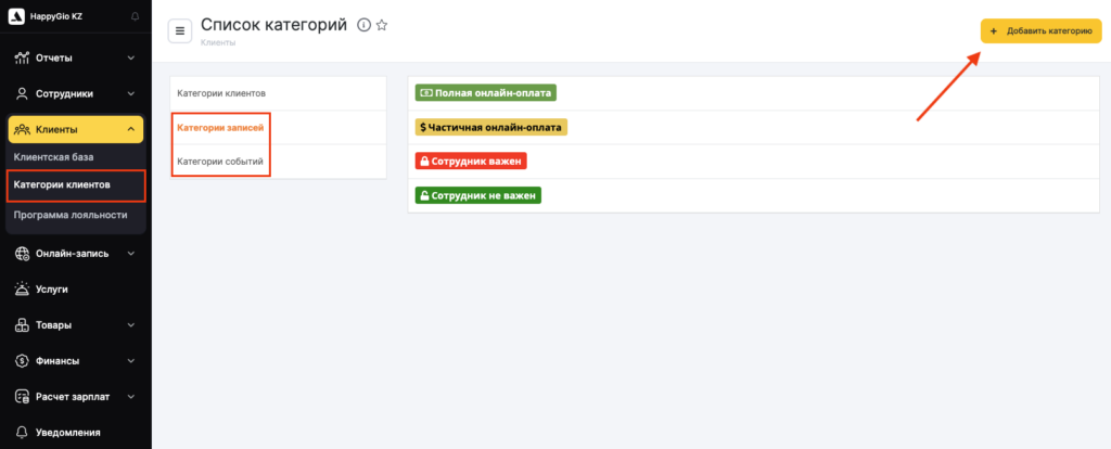 По умолчанию создано 4 категории записей: Полная онлайн-оплата, Частичная онлайн-оплата, Сотрудник важен, Сотрудник неважен.