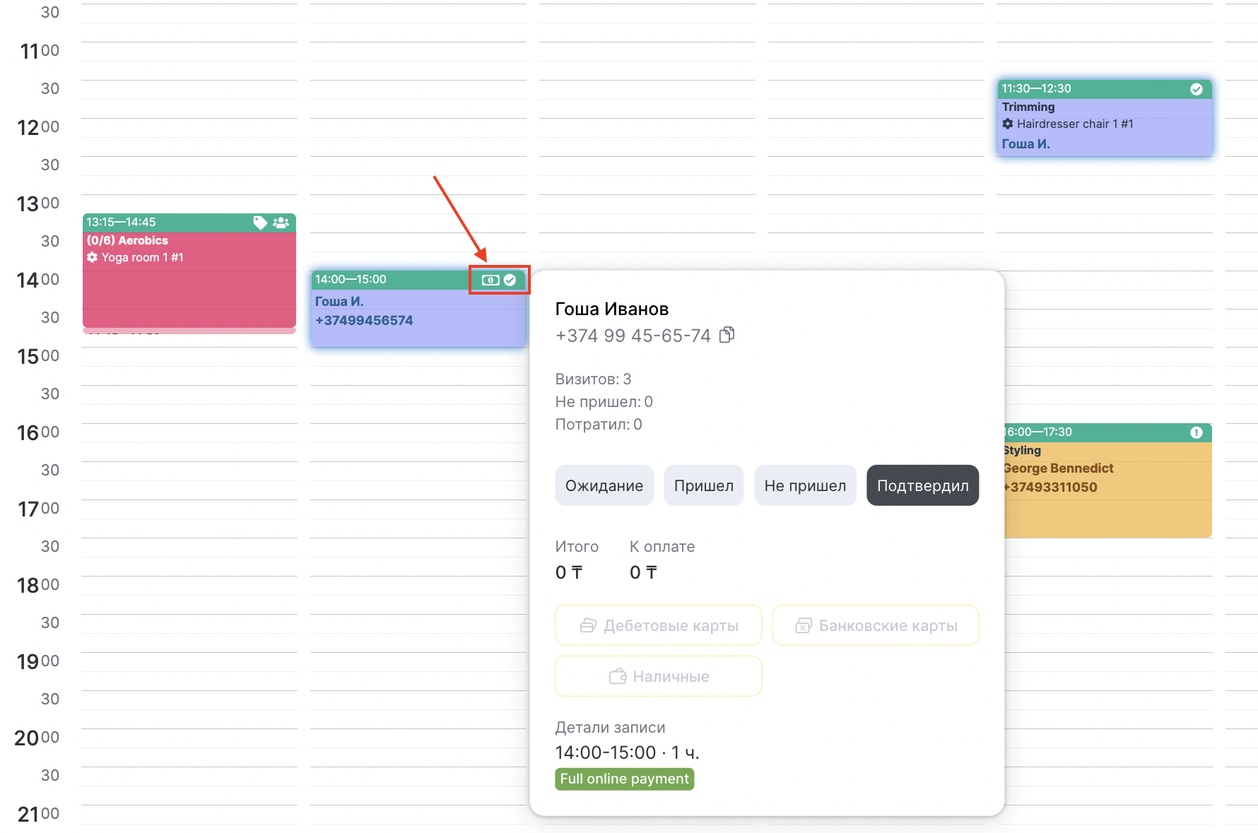 - Полная онлайн-оплата означает, что клиент заранее полностью оплатил визит с помощью онлайн-оплаты.