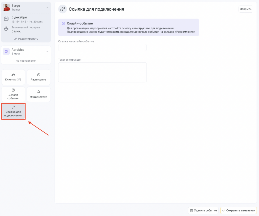После этого откройте вкладку «Ссылка для подключения» в боковой панели окна записи.