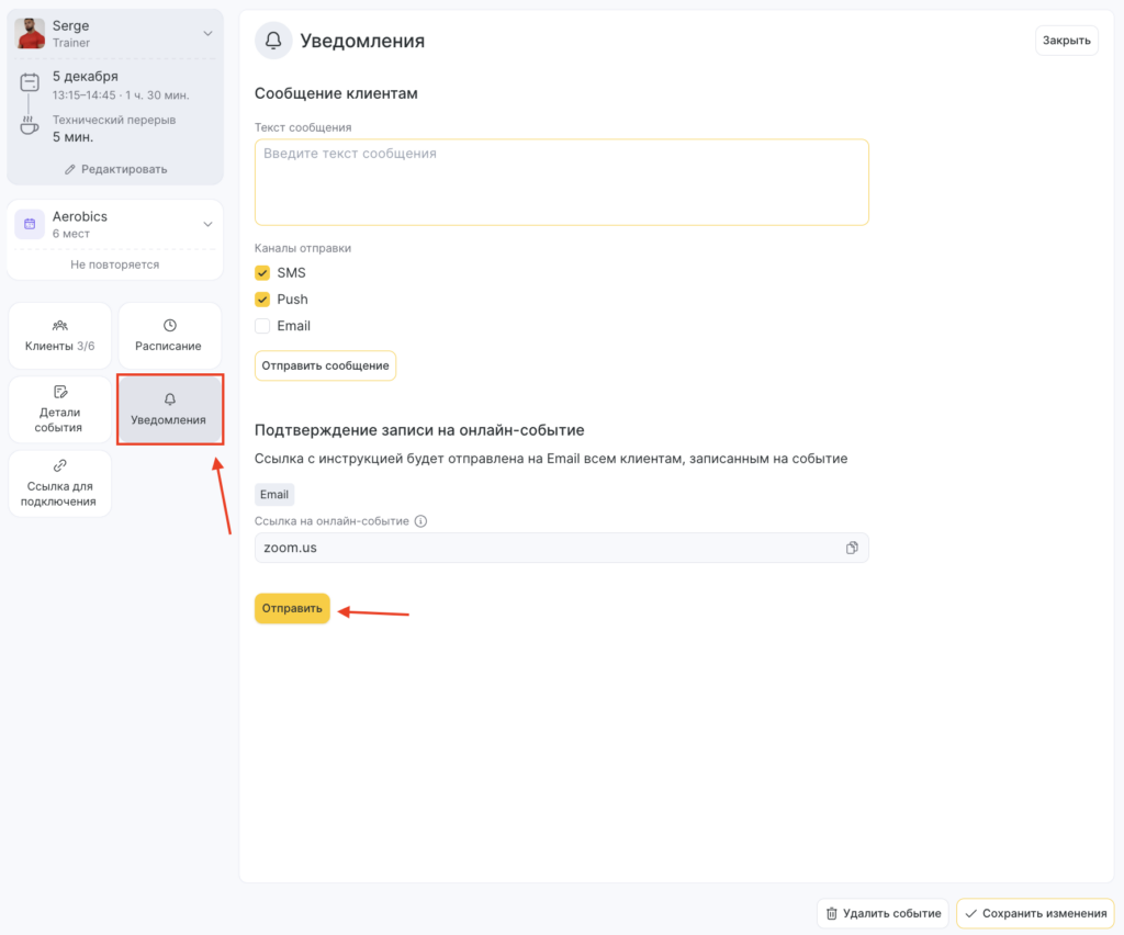 - Перейдите на вкладку «Уведомления», отправьте инструкцию клиентам: