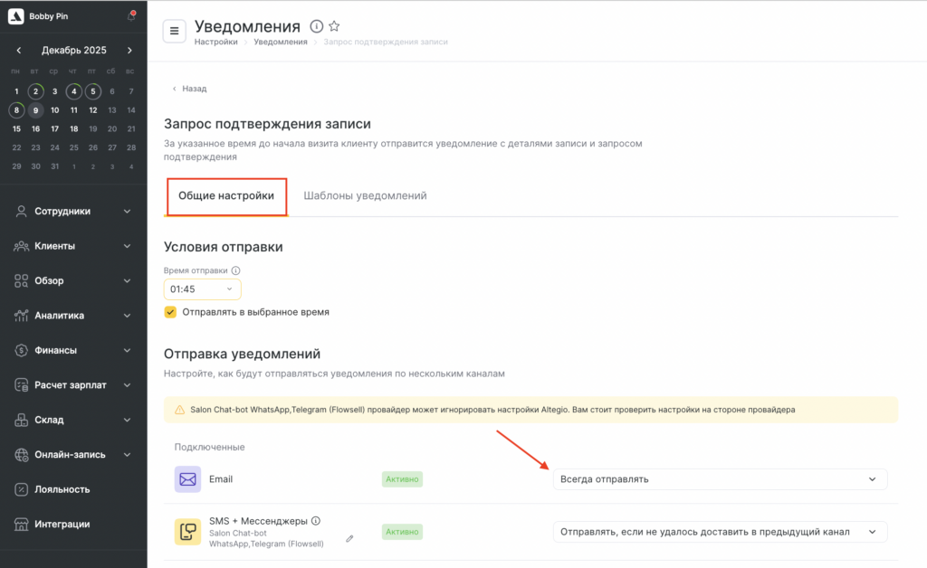 Выберите тип Подтверждение записи клиента, созданной через виджет онлайн-записи: