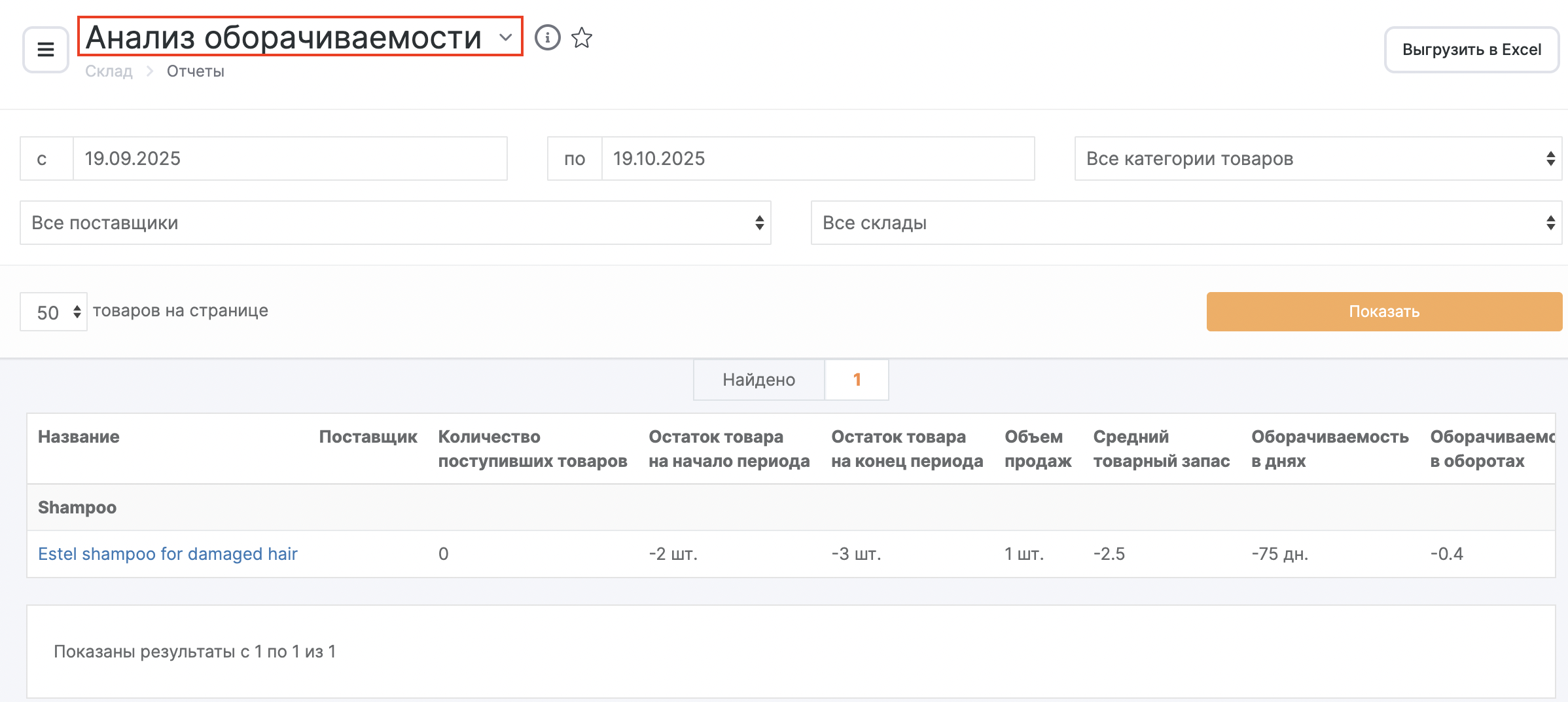 Отчет по оборачиваемости можно просмотреть в разделе «Склад» > «Отчеты» > «Анализ оборачиваемости».