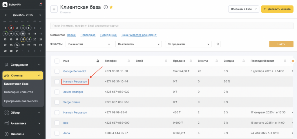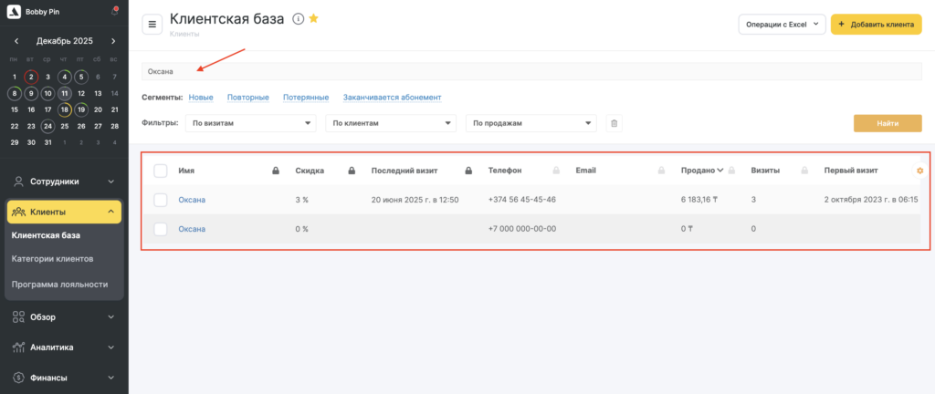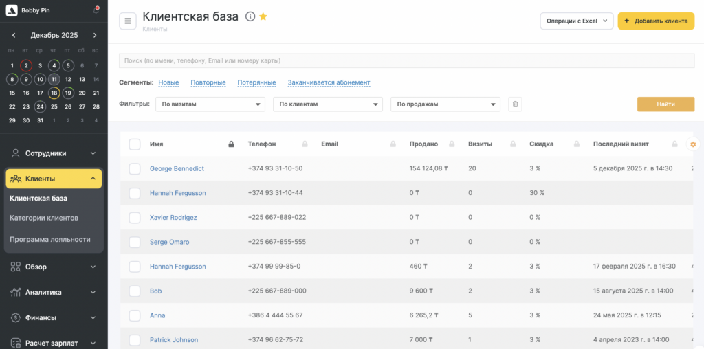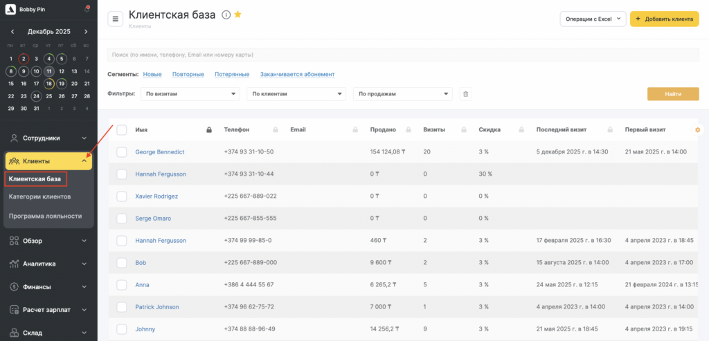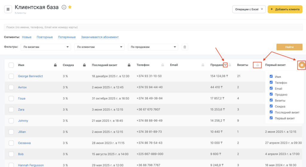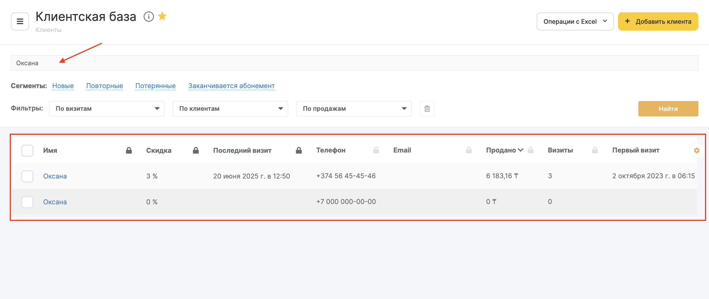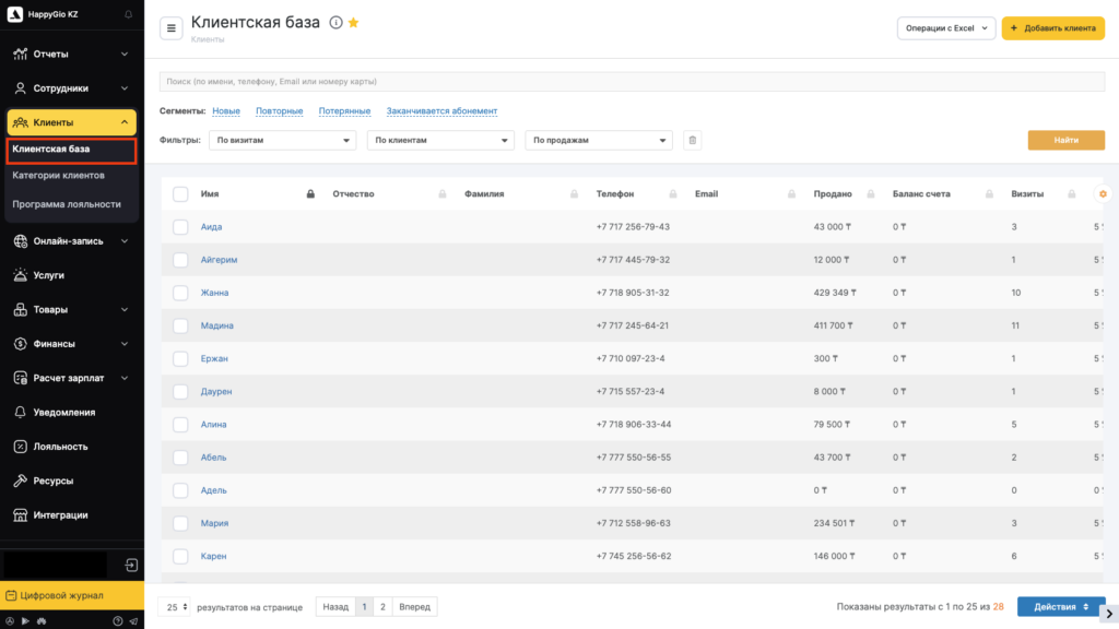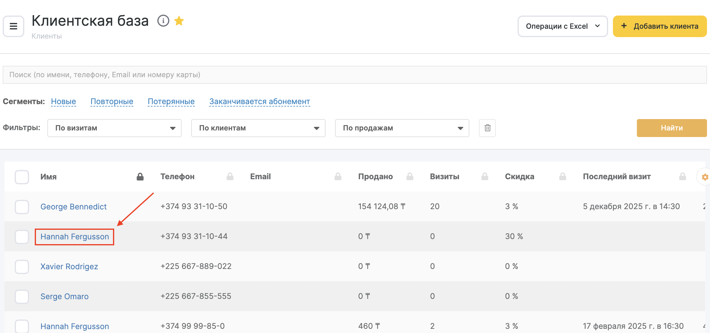 В разделе Клиенты > Клиентская база отображается информация обо всех клиентах, посещавших вашу компанию.