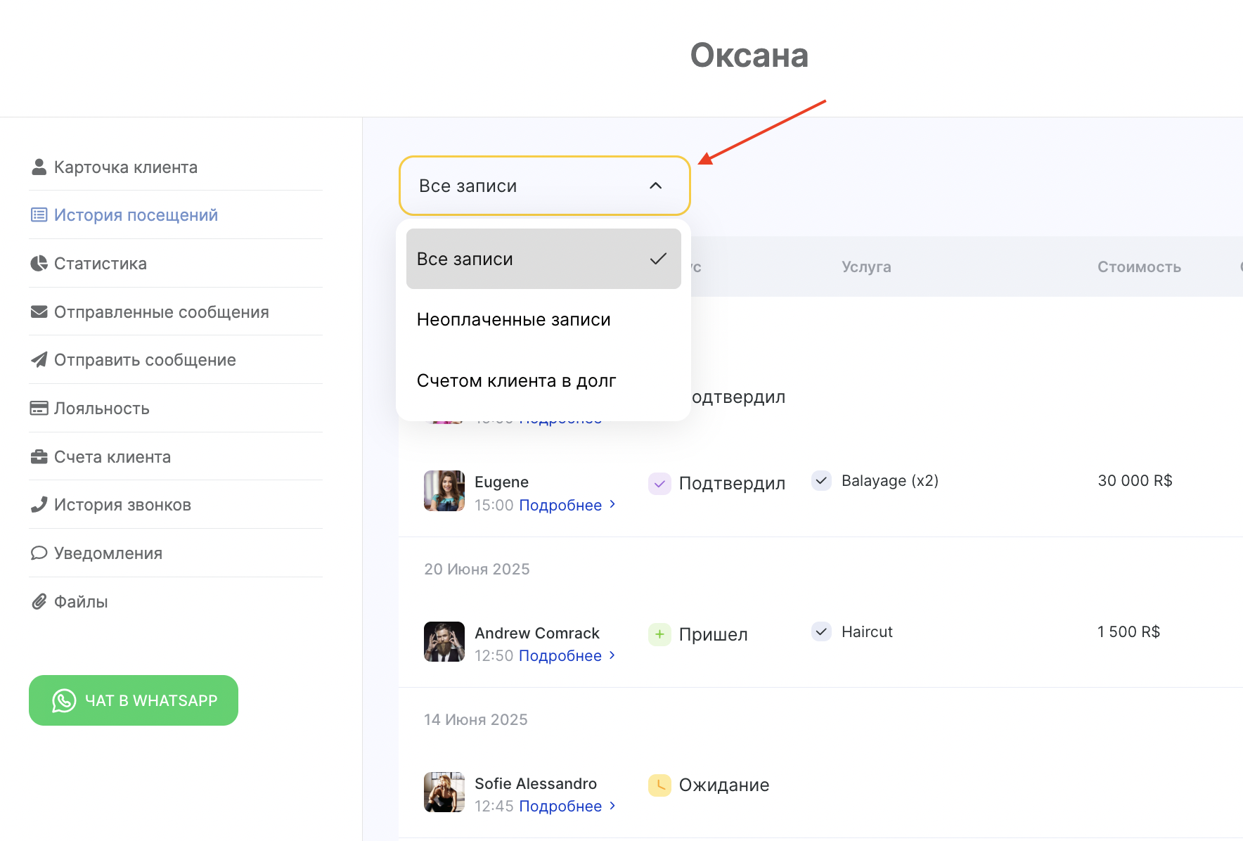 В этом разделе указываются все записи клиента, сотрудники, к которым он записывался, услуги, которые были ему предоставлены, приобретенные товары, скидки, оплаченные суммы и оставленные чаевые, комментарии к записи, а также указываются филиалы, которые посещал клиент.Из «Истории посещений» можно перейти в визит, для этого нужно нажать на кнопку «Подробнее».