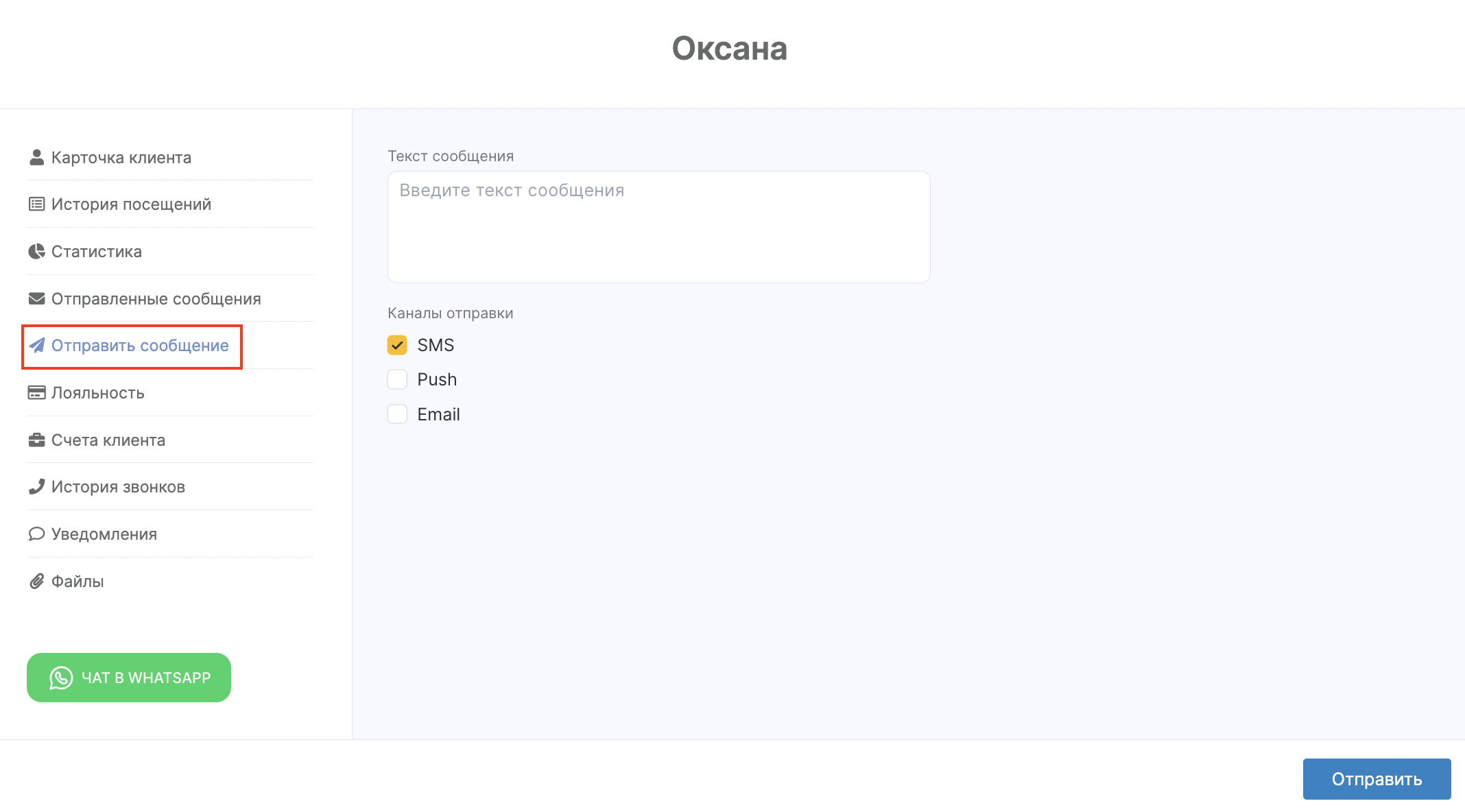 В этом разделе вы можете отправить индивидуальное сообщение клиенту по трем каналам: SMS, Push-уведомление в мобильное приложение или Email.