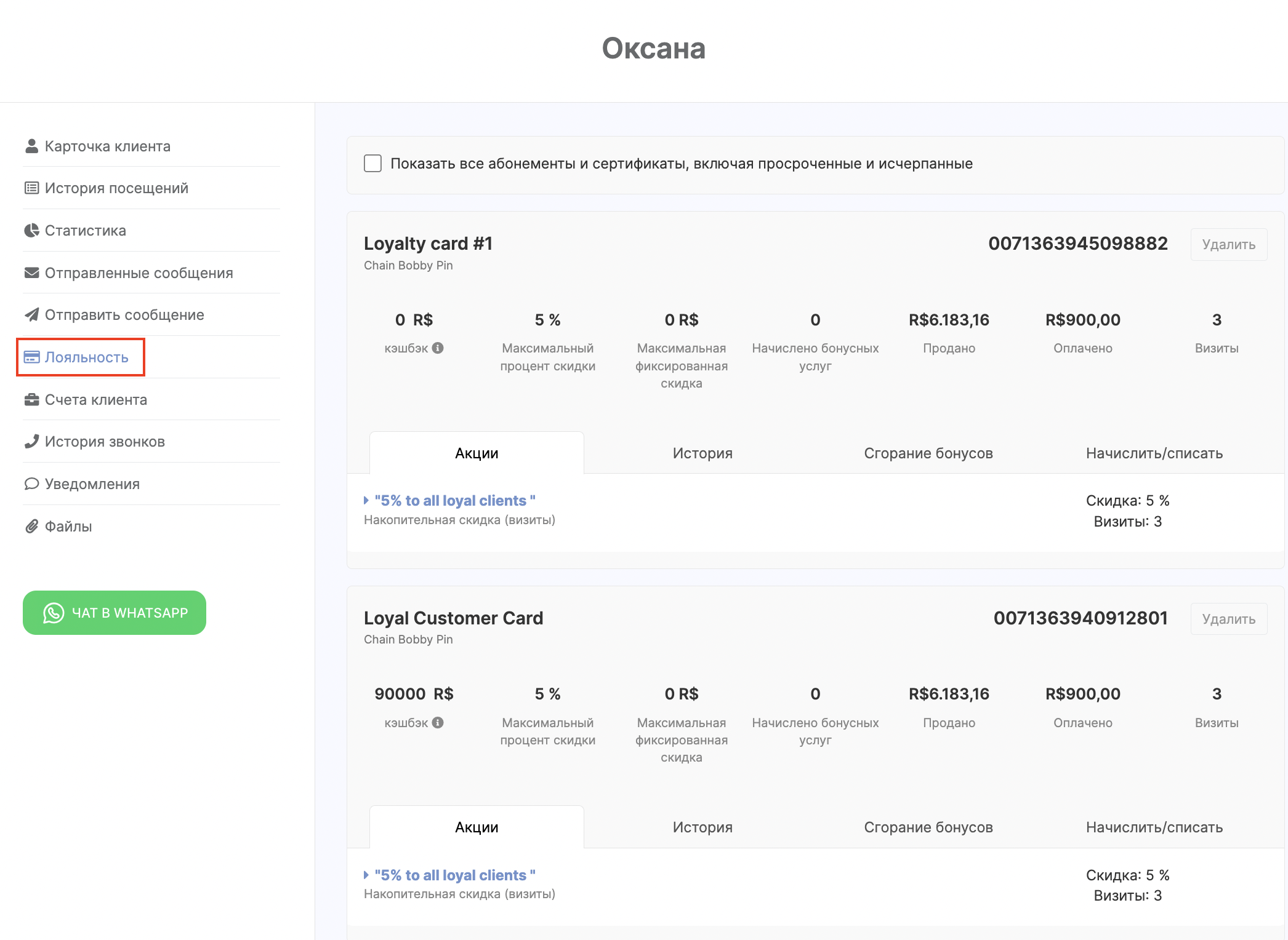 Здесь отображаются все сертификаты и абонементы, а также карты лояльности, которые были выданы клиенту, и информация по ним: