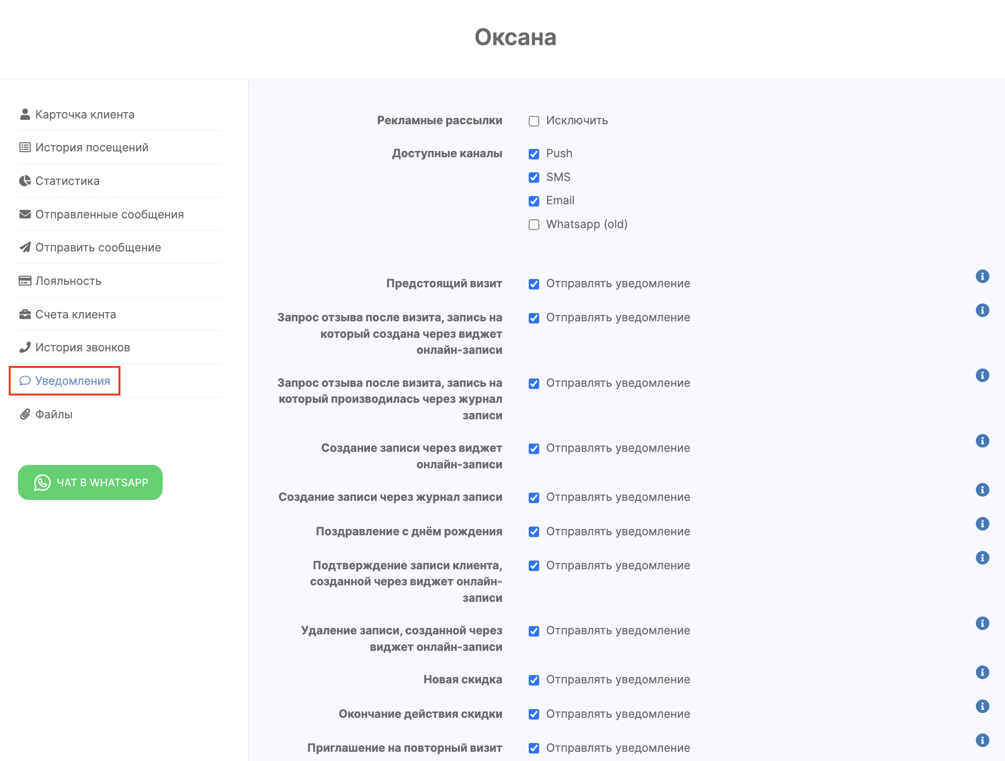 В карточке клиента можно настроить отправку сообщений определенного типа или запретить отправку определенных видов сообщений.При рекламных рассылках, галочка рассылки позволяет включить или отключить отправку массовых рассылок для данного клиента.