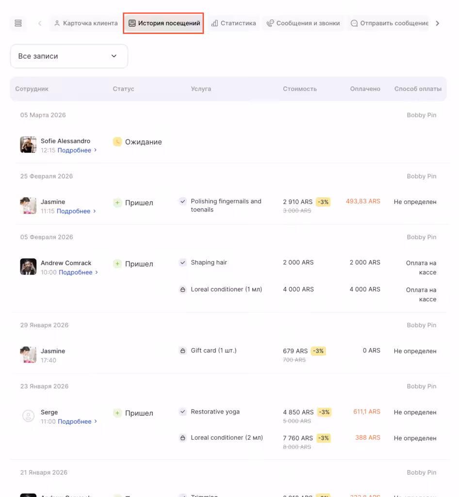 В этом разделе указываются все записи клиента, сотрудники, к которым он записывался, услуги, которые были ему предоставлены, приобретенные товары, скидки, оплаченные суммы и оставленные чаевые, комментарии к записи, а также указываются филиалы, которые посещал клиент. Из раздела История посещений можно перейти в визит, для этого нужно нажать на кнопку Подробнее.