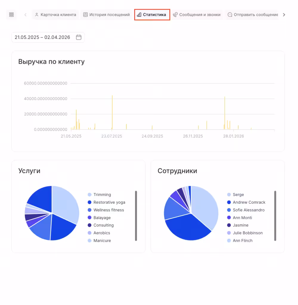 В этом разделе отображаются данные о выручке по клиенту и его предпочтения за выбранный период.