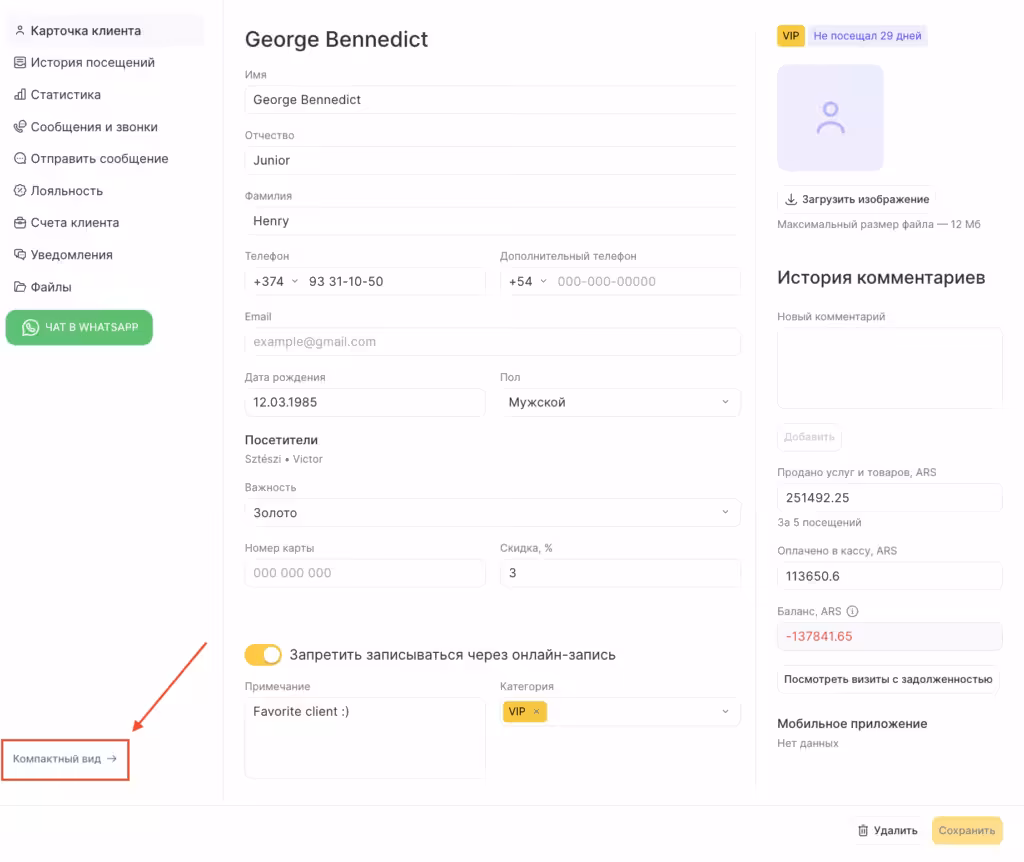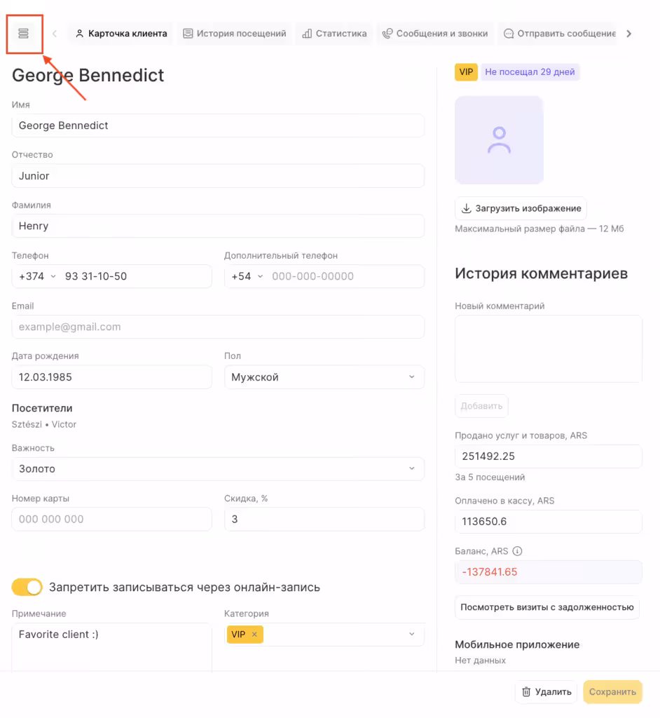 Для этого также используется карточка клиента. Подробнее о том, как это сделать, вы можете прочитать в статье.