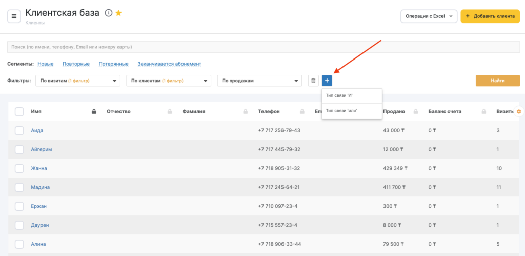 При использовании «Типа связи «И»» будут найдены только те клиенты, которые удовлетворяют каждому условию фильтрации.