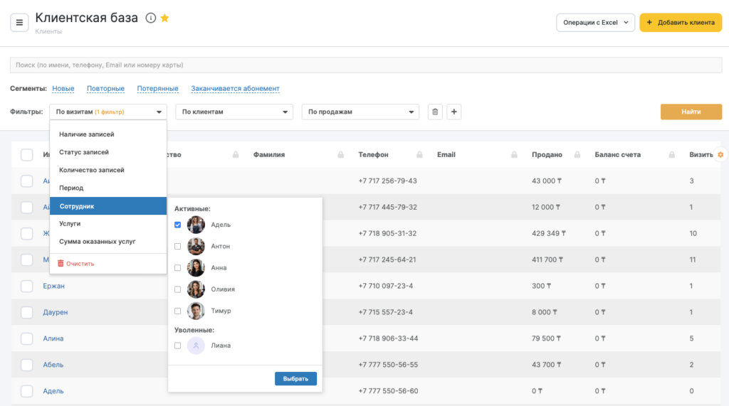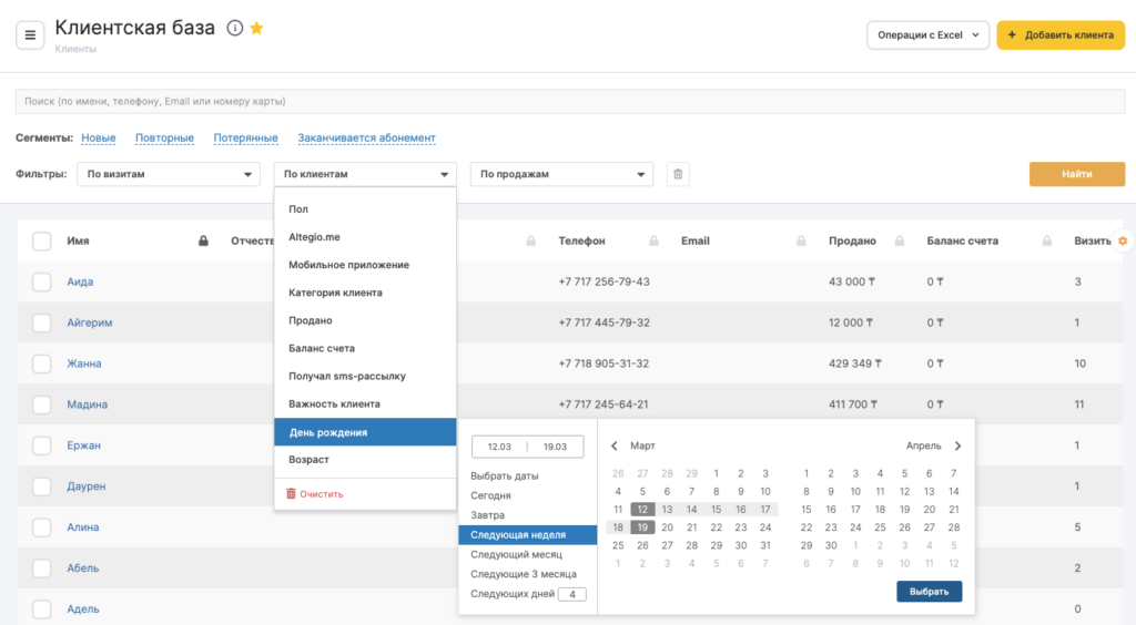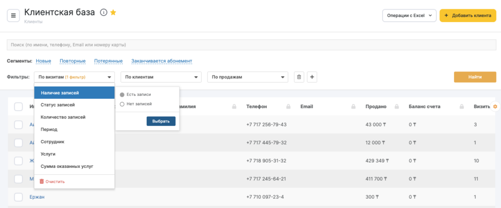 Для сегментации клиентов в разделе «Клиенты» > «Клиентская база» предусмотрен ряд фильтров. Вы можете сформировать список клиентов, для которых можно создать SMS-рассылку (при наличии подключенного SMS-агрегатора) или присвоить им определенную категорию.