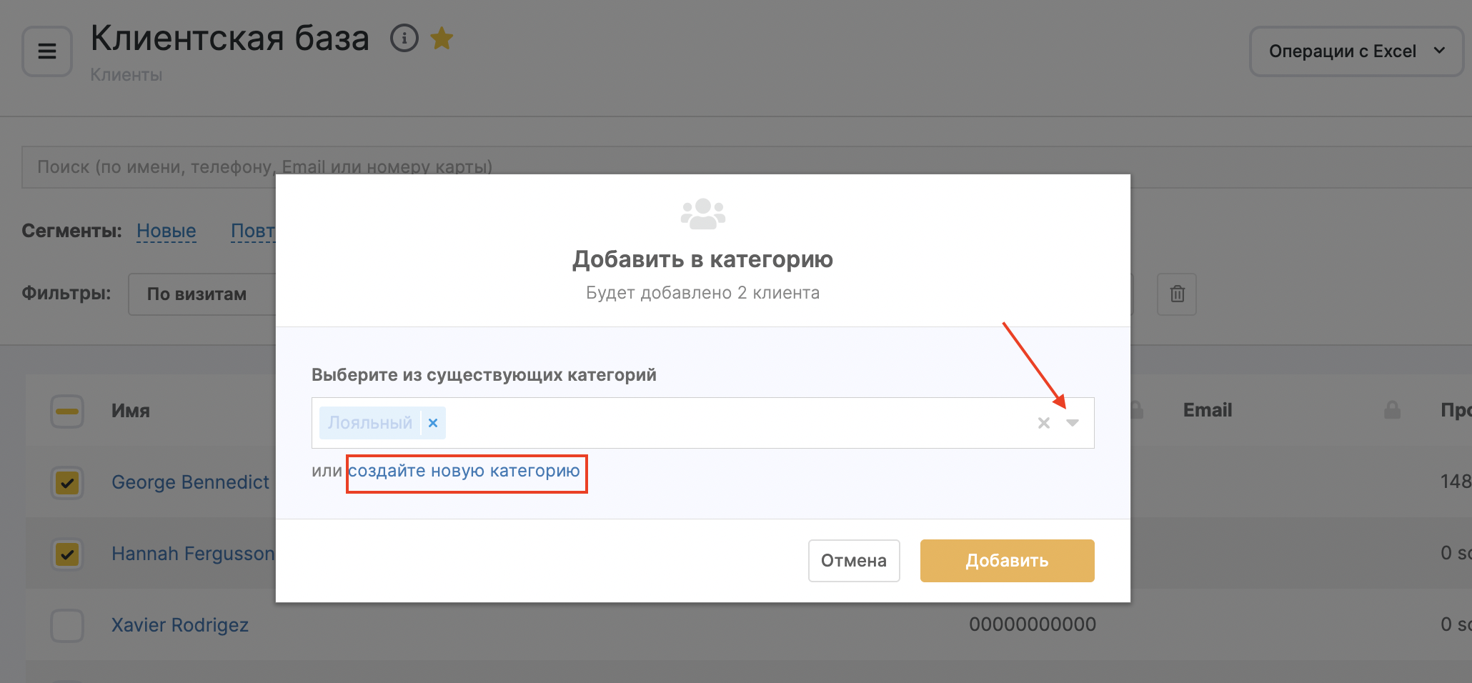 После этого выберите существующую категорию, куда нужно добавить клиентов. Или быстро создайте новую категорию, указав название категории и цвет: