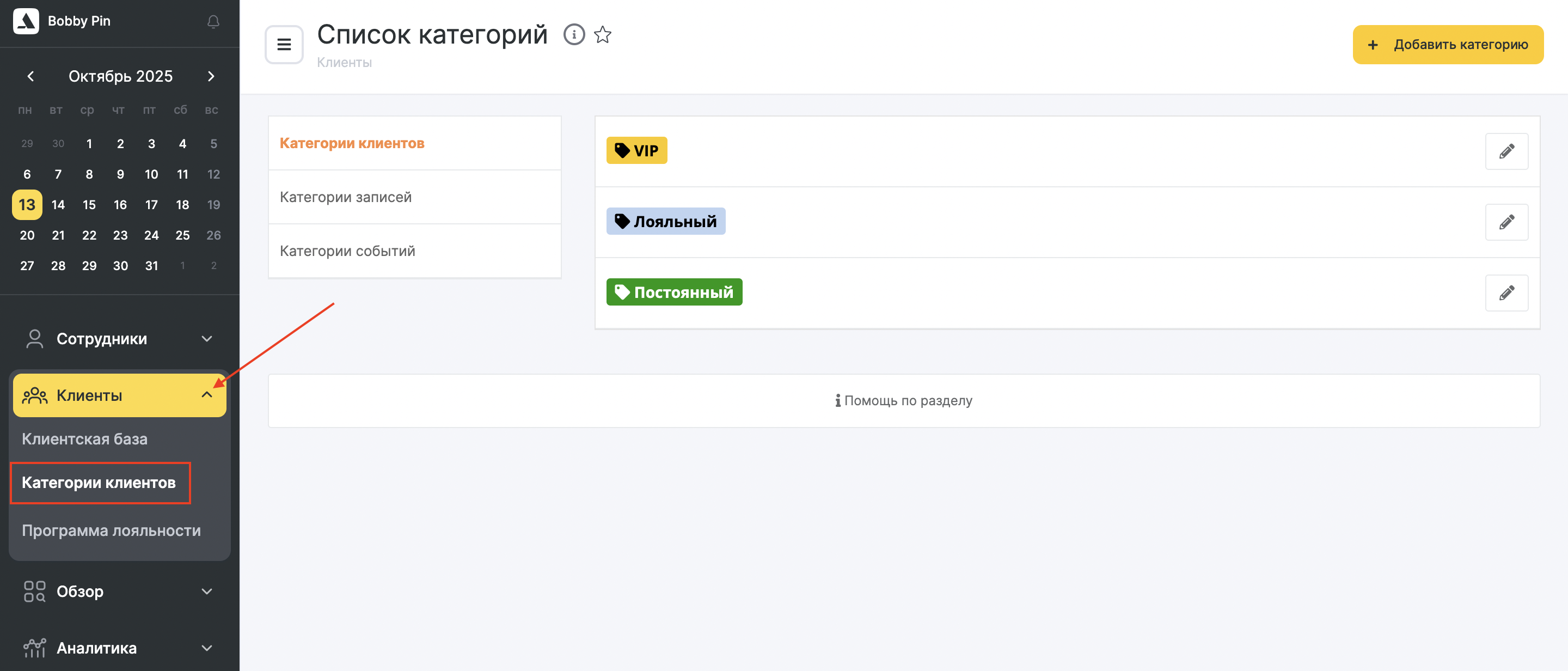 Перейдите в раздел «Клиенты» > «Категории клиентов» и нажмите кнопку «Добавить категорию». Укажите название категории и выберите цвет метки, нажмите кнопку «Сохранить». После этого новая категория появится в общем списке.