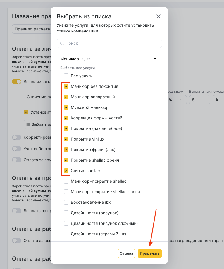 - Если за выполнение отдельных услуг сотруднику нужно назначить иной процент, включите опцию Установить индивидуальные значения для услуг или категорий.