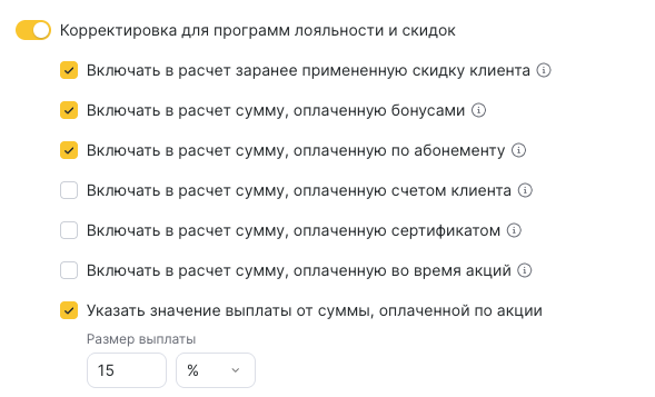 - Если включить корректировку, в расчёт заработной платы будет использоваться полная стоимость услуги, без уменьшения на скидки клиента, оплату бонусами, сертификатами, акциями или абонементами.