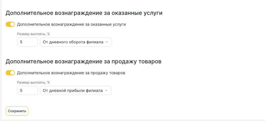 - Активируйте Дополнительное вознаграждение за оказанные услуги или за продажу товара
