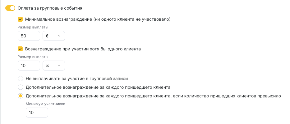 - Не выплачивать за участие в групповой записи. Дополнительное вознаграждение за клиентов не начисляется. Сотрудник получит только минимальное вознаграждение либо вознаграждение при участии хотя бы одного клиента (если указано).