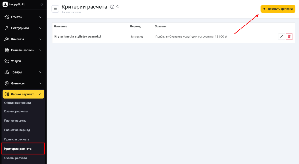 Перейдите в режим Администрирование в раздел Расчет зарплат > Критерии расчета. Нажмите кнопку Добавить критерий, в открывшемся окне отредактируйте всю информацию и нажмите кнопку Сохранить.