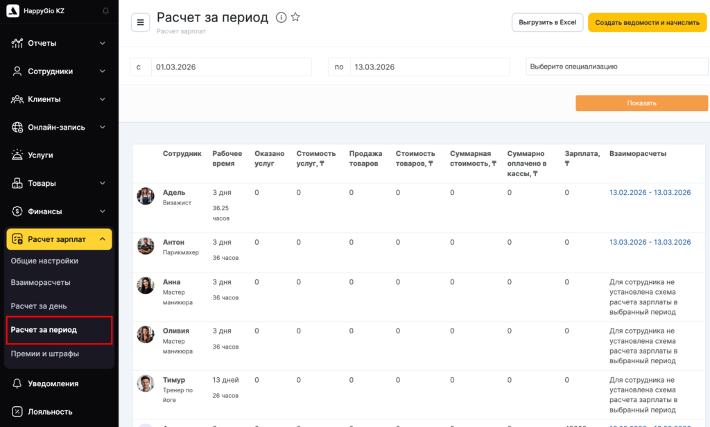 В Altegio есть возможность произвести расчеты за указанный период и начислить зарплату каждому сотруднику отдельно или сразу всем сотрудникам.