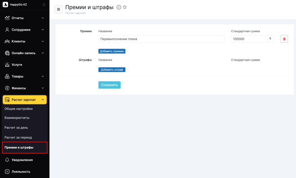 Премии и штрафы могут начисляться по различным показателям, которые вы устанавливаете сами. Например, премия за вернувшихся клиентов, отсутствие опозданий, хорошую работу и т.д. Штрафы за опоздание, за недобросовестную работу, испорченное оборудование и т.д.