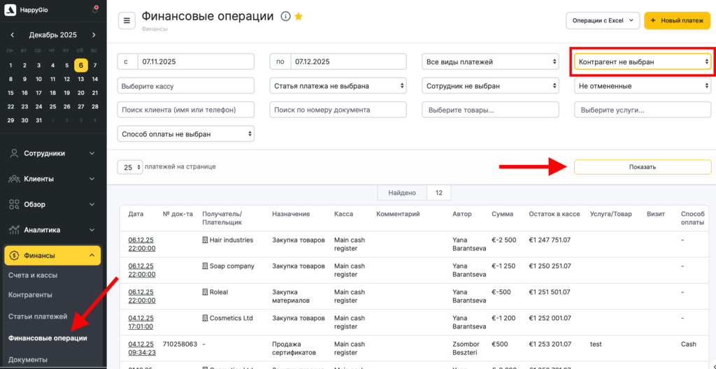 Для просмотра истории операций с контрагентом перейдите в раздел «Финансы» > «Финансовые операции». С помощью фильтра выберите контрагента и нажмите кнопку «Показать». В этом отчете можно отфильтровать данные по времени, типу платежей и кассе, из которой происходил расчет.