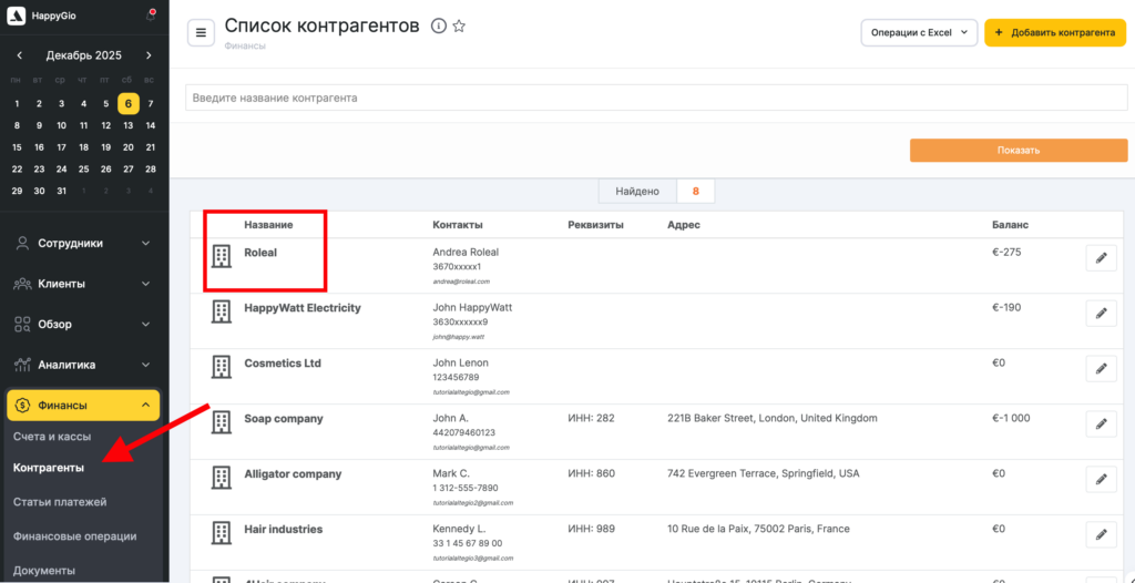 Также вы можете перейти на страницу финансовых операций с контрагентом через раздел «Финансы» > «Контрагенты». Для этого нажмите на название контрагента, и Altegio перенаправит вас в раздел «Финансы» > «Финансовые операции», где уже будет установлен фильтр по выбранному контрагенту.