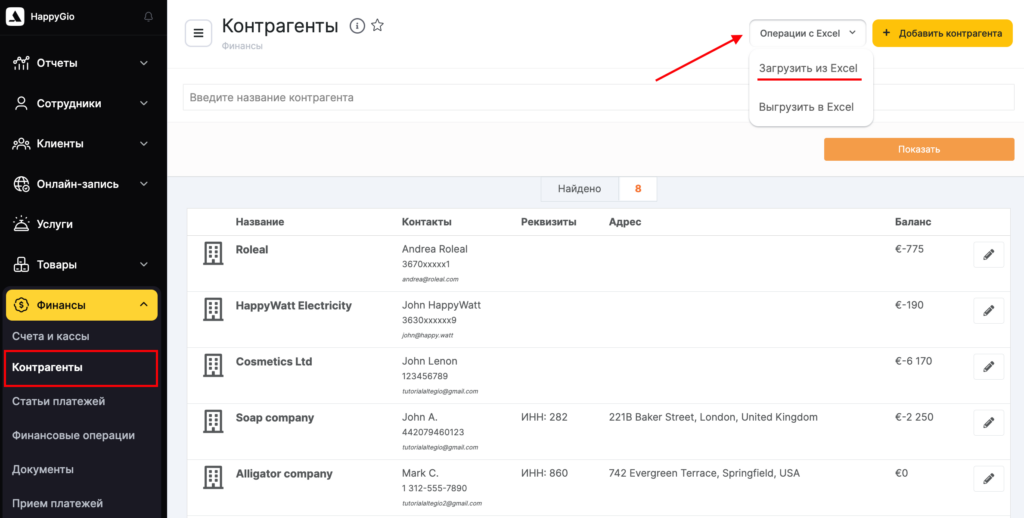 - В режиме Администрирование перейдите в раздел Финансы > Контрагенты.