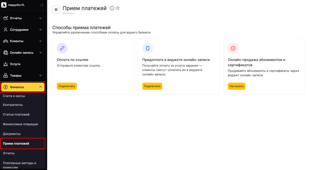 1. Перейдите в раздел Финансы >Прием платежей или в раздел Настройки > блок Финансы > Прием платежей.