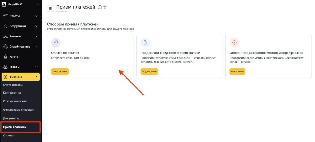- После этого перейдите в Altegio, в режим Администрирование в раздел Финансы > Прием платежей. В нашем примере мы используем вариант Оплата по ссылке: