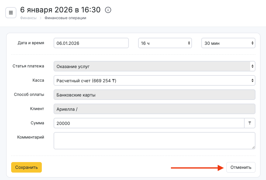 Чтобы удалить финансовую транзакцию, в разделе Финансы > Финансовые операции откройте нужную транзакцию, нажав на дату ее проведения, и затем нажмите кнопку Отменить. Подтвердите удаление во всплывающем окне.