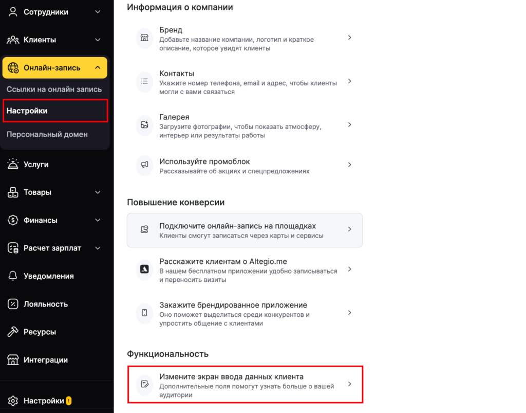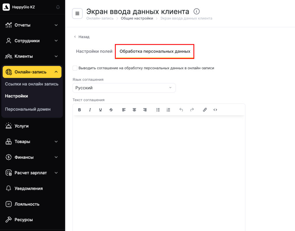 При онлайн-записи любой пользователь соглашается с Условиями использования и Политикой конфиденциальности. Для этого перейдите в раздел Онлайн-запись > Общие настройки.