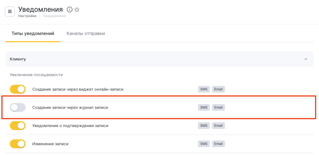 Для отключения отправки SMS-уведомления при создании записи в журнале перейдите в раздел Настройки > Системные настройки > Уведомления на вкладку Типы уведомлений и переведите ползунок в неактивное состояние напротив типа Создание записи через журнал записи.