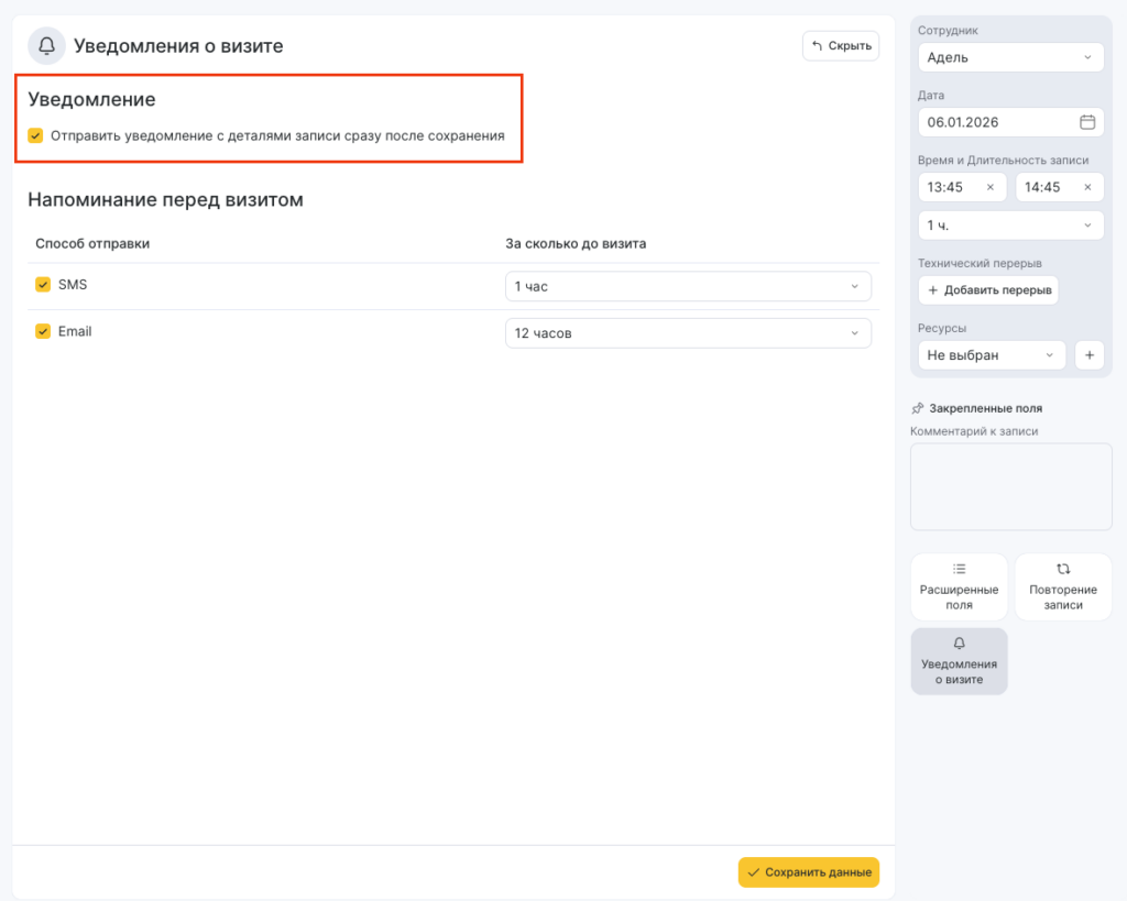 Для этого при создании записи перейдите в раздел Уведомления о визите в окне визита и поставьте галочку напротив пункта Отправить уведомление с деталями записи сразу после сохранения.
