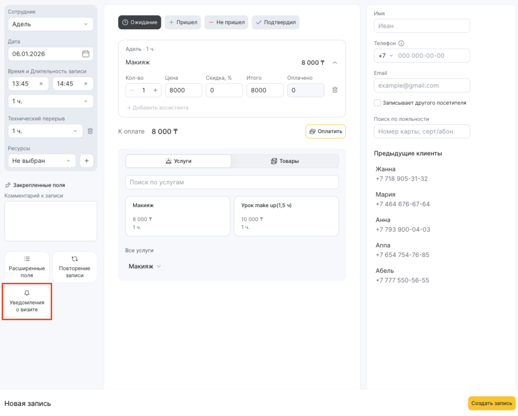 Также здесь вы можете изменить время отправления напоминания клиенту о предстоящем визите (подробнее в статье).