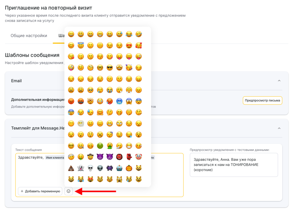 В SMS-шаблонах уведомлений вы можете использовать Emoji смайлы, для этого нажмите на кнопку со смайлом и выберете нужный из предложенных или добавьте свой.