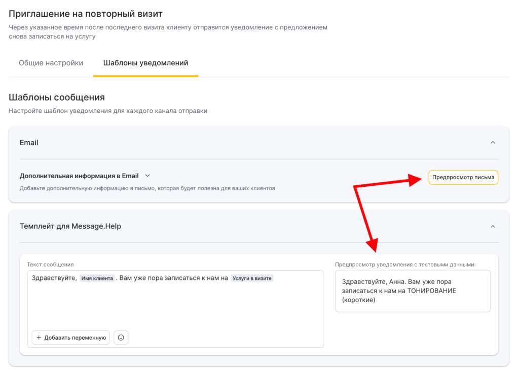 - Для всех шаблонов уведомлений доступен предпросмотр — как будет выглядеть сообщение при отправке клиенту, сотруднику или администратору, с учетом переменных.