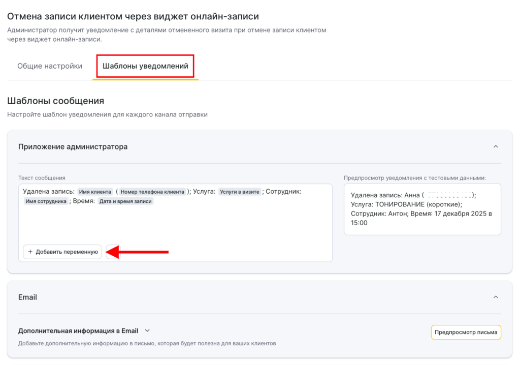 В каждом шаблоне есть переменные (ссылки на параметры визита в журнале записи). Вместо этих переменных автоматически выводятся данные о записи: