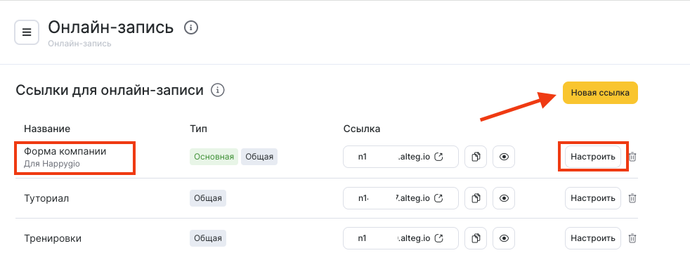 - Выберите нужную ссылку онлайн-записи, нажмите ее название или кнопку Настроить, чтобы перейти в режим редактирования.