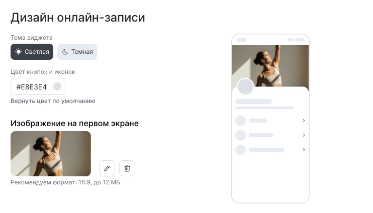 В Altegio можно установить любой цвет интерфейса, настроить дизайн виджета под свой бренд, добавить логотип и изображения.