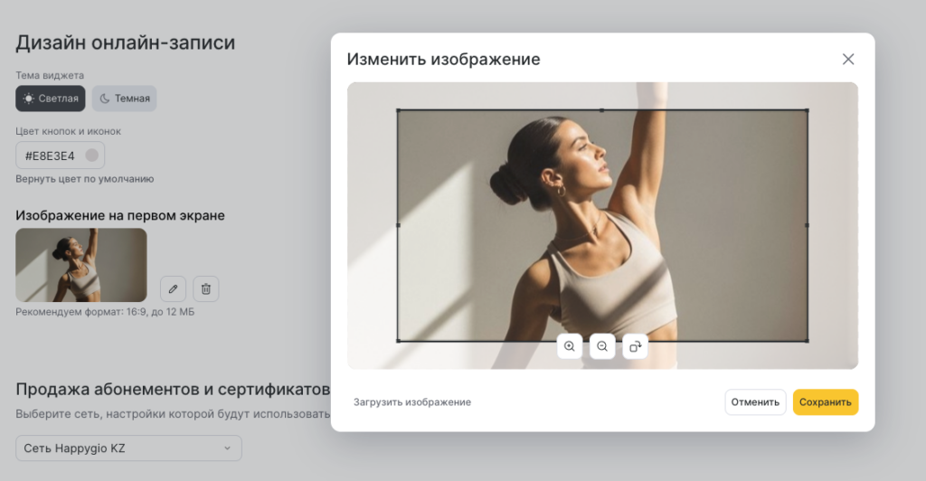 - Чтобы загрузить изображение на первом экране, нажмите на кнопку Загрузить изображение. В открывшемся окне найдите раздел Дизайн онлайн-записи.