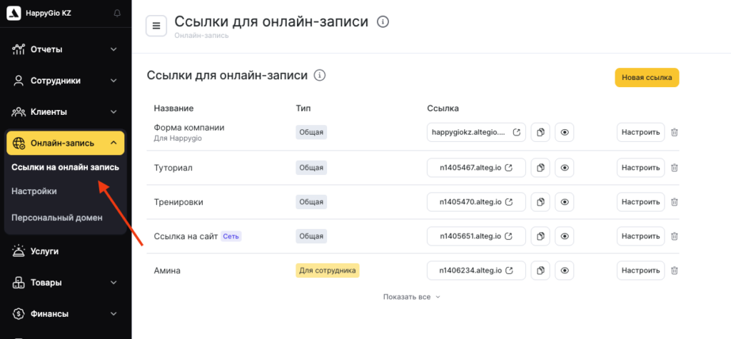 - Перейдите в раздел Онлайн-запись > Ссылки на онлайн запись.