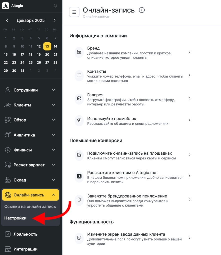 Для этого перейдите в основном меню в раздел Онлайн-запись > Настройки.