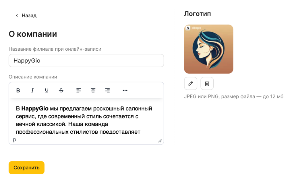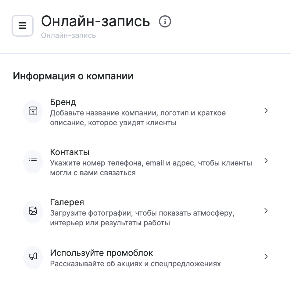 Блок Информация о компании помогает настроить информацию о вашем бизнесе, которая будет отображаться в онлайн-записи. Именно с этой информации начинается знакомство клиентов с вашим бизнесом.