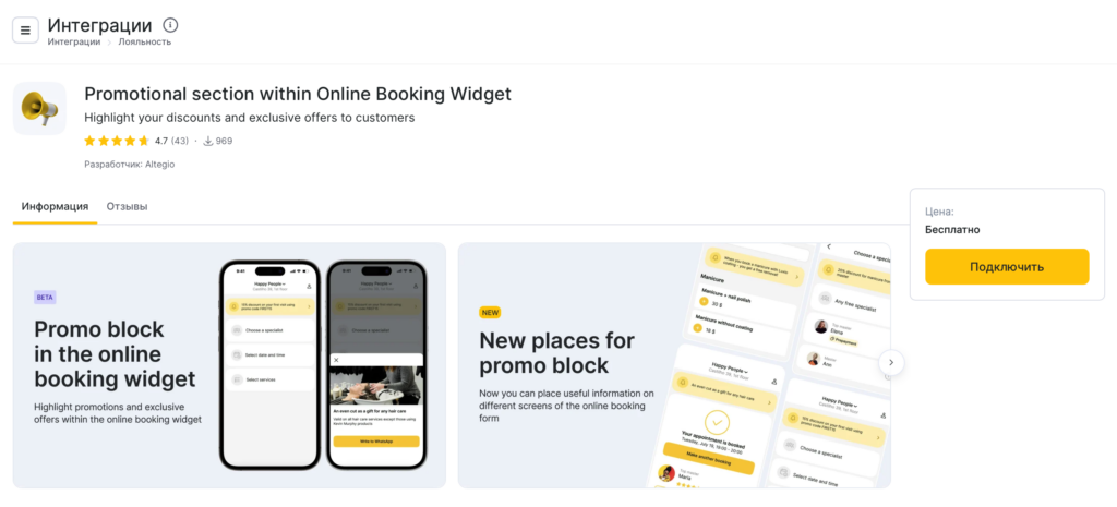 Расскажите о лучших предложениях или акциях, чтобы привлечь больше клиентов. Это может быть временная скидка, сезонное предложение или бонус для первого визита. Для использования этой функции потребуется подключить бесплатную интеграцию.