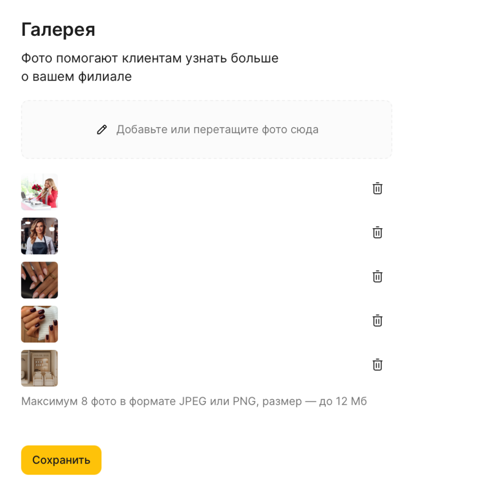 Загрузите фотографии, которые передают стиль, атмосферу и уровень вашей работы. Это особенно важно для бьюти, wellness и сервисных бизнесов, где наглядные примеры помогают клиентам почувствовать доверие и принять решение о записи.