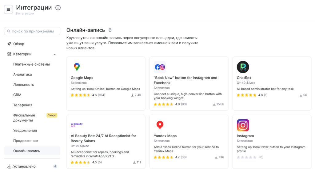 Клиенты смогут записываться на ваши услуги прямо из карт и партнёрских сервисов, таких как Google Maps, Yandex Maps, Instagram и другие. Перейдите в этот раздел и настройте доступные интеграции.