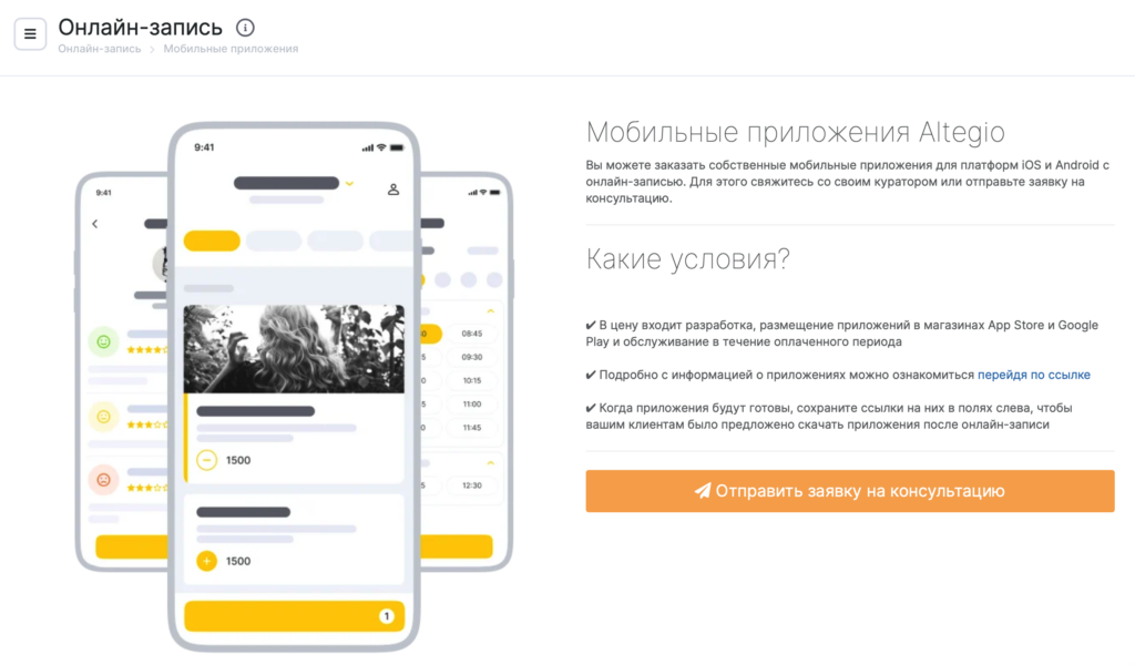 Разработайте полностью брендированное мобильное приложение для вашего бизнеса, чтобы повысить узнаваемость и упростить общение с клиентами. При переходе в этот раздел вы будете перенаправлены на страницу, где сможете сразу оставить заявку на консультацию с менеджером Altegio по созданию фирменного приложения.