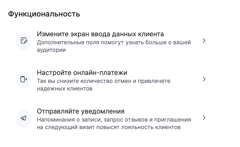 Блок Функциональность включает основные инструменты, которые позволяют гибко настроить работу онлайн-записи под ваш бизнес.